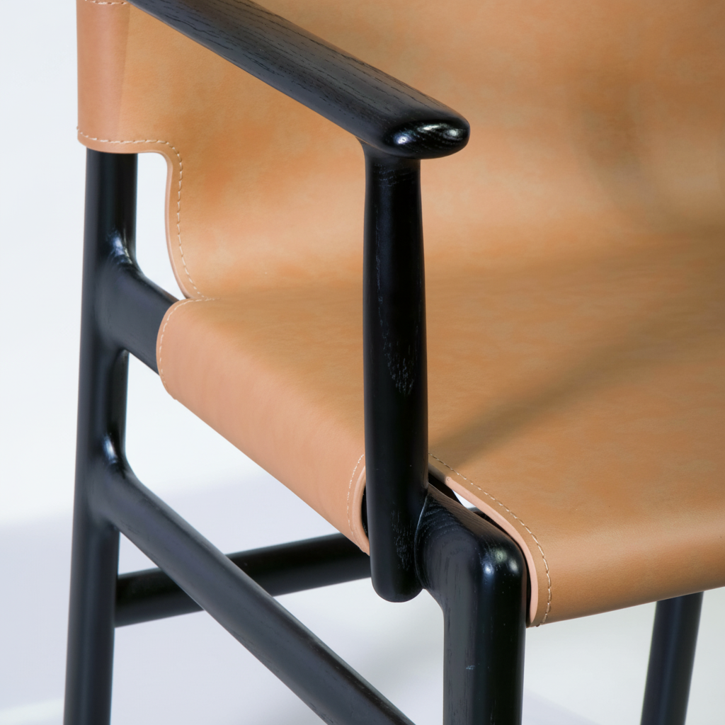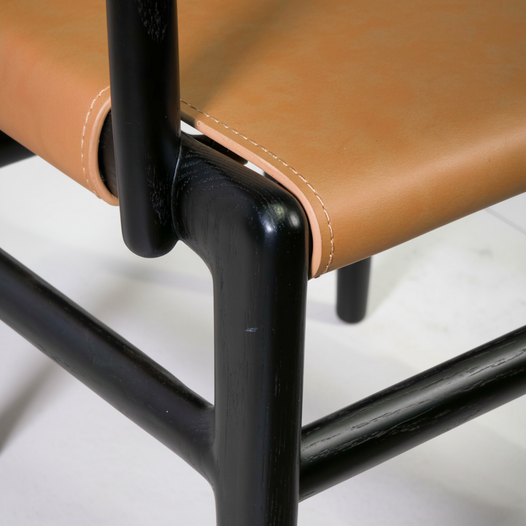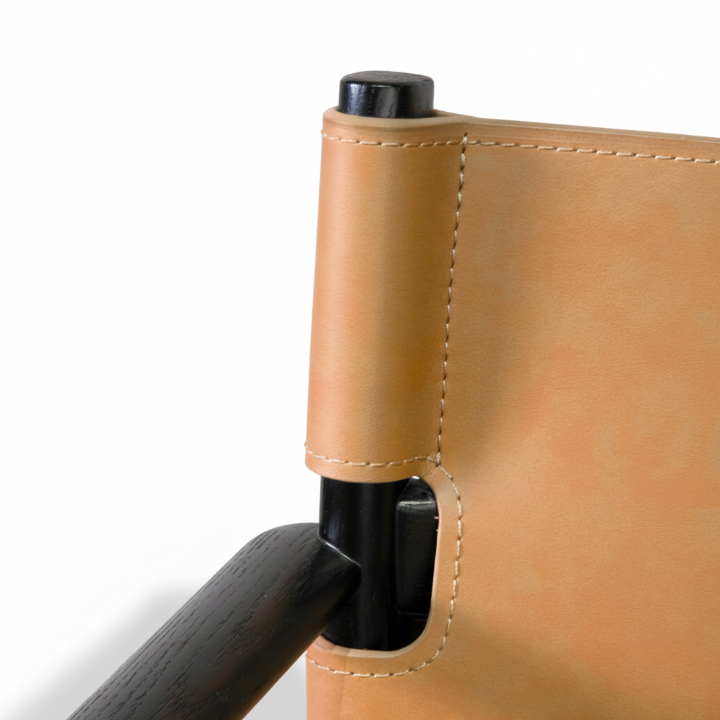 Khung ghế được chế tác từ gỗ sồi Mỹ bền chắc, xử lý hun màu để đạt sắc độ trầm ấm, dễ phối hợp với nhiều phong cách nội thất. Phần da yên ngựa căng trên khung, cùng các đường may thủ công tinh xảo, đảm bảo độ bền và sự đàn hồi lâu dài. Kết cấu ghép mộng gỗ giữ cho sản phẩm vững chắc mà vẫn thanh thoát.