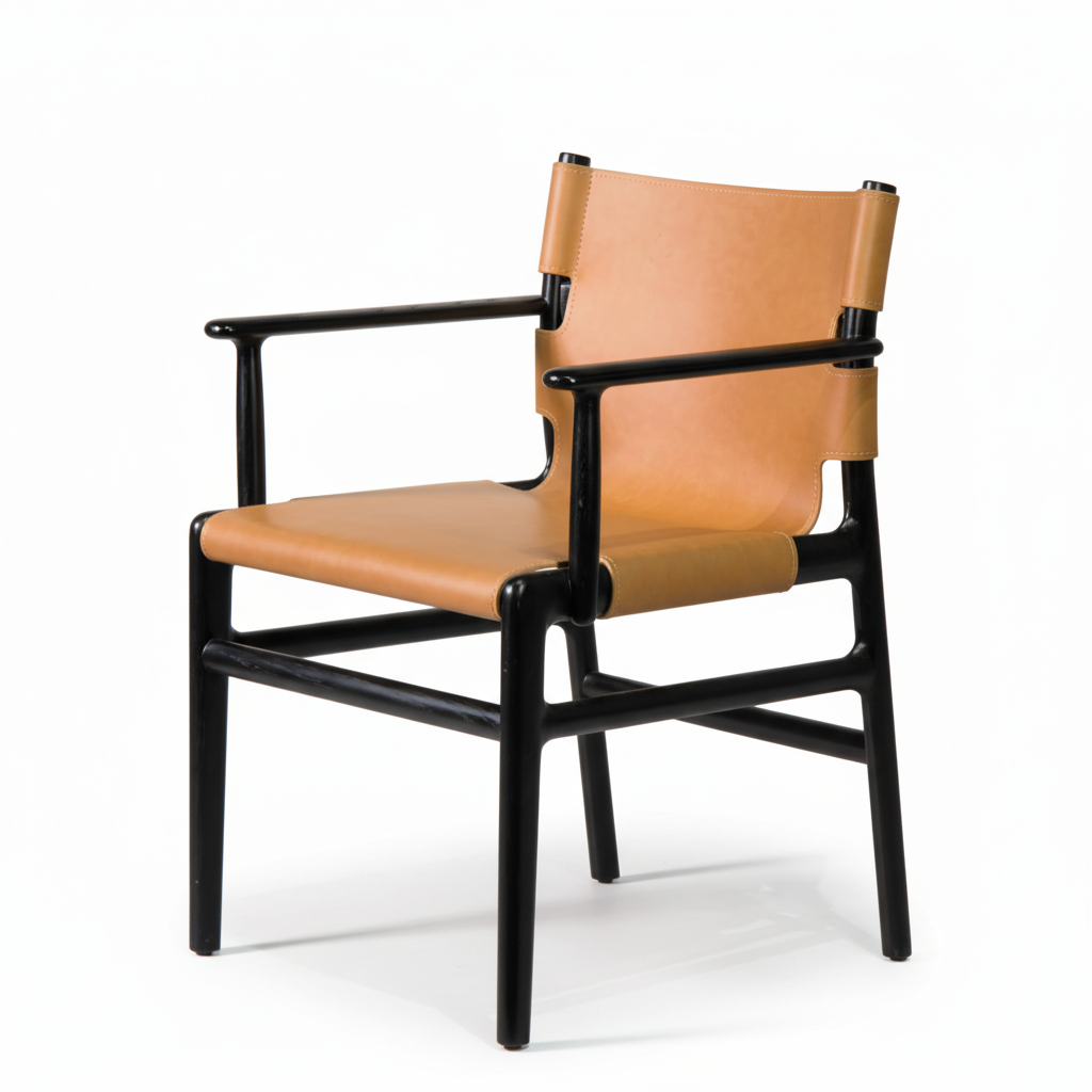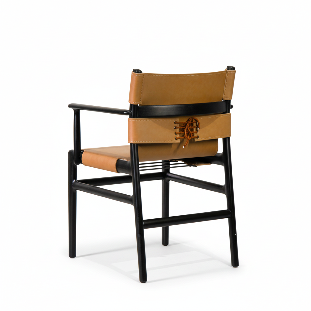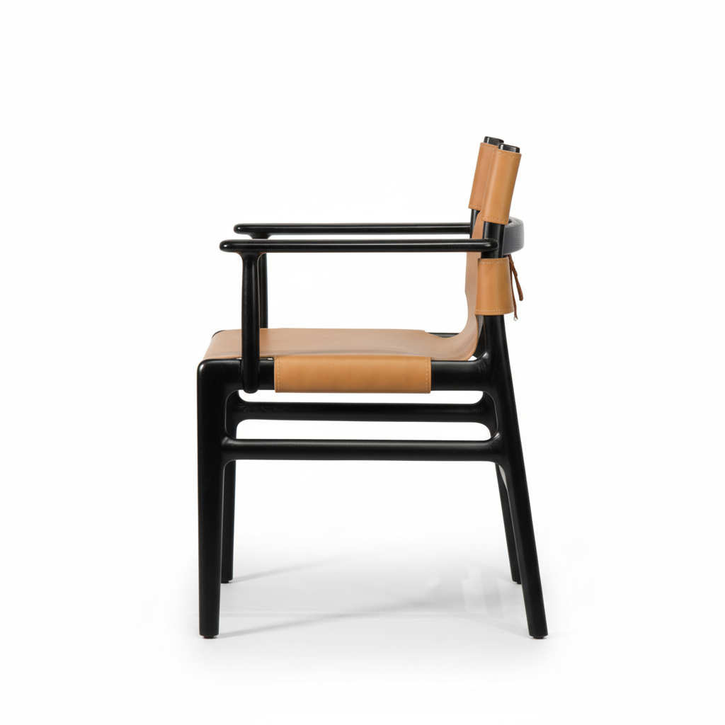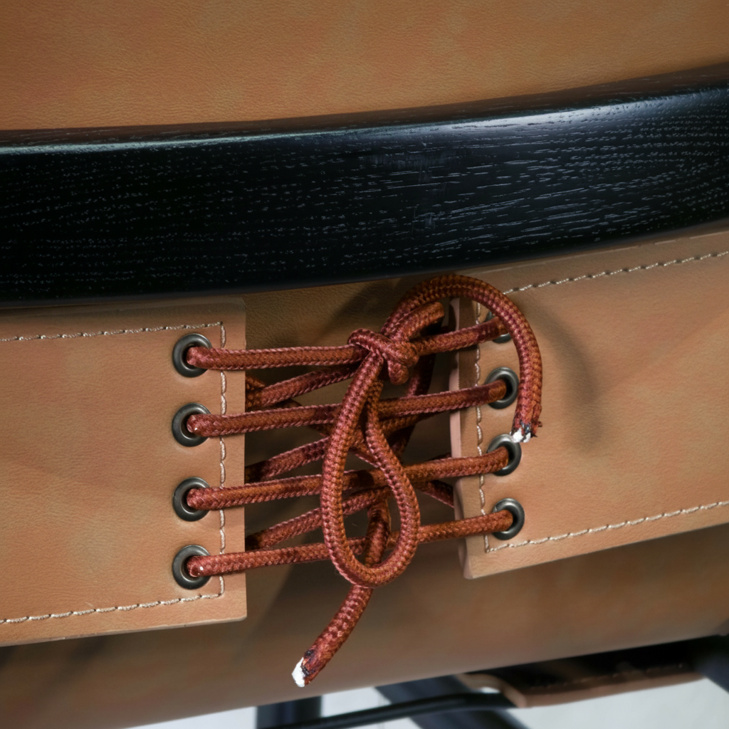 Khung ghế được chế tác từ gỗ sồi Mỹ bền chắc, xử lý hun màu để đạt sắc độ trầm ấm, dễ phối hợp với nhiều phong cách nội thất. Phần da yên ngựa căng trên khung, cùng các đường may thủ công tinh xảo, đảm bảo độ bền và sự đàn hồi lâu dài. Kết cấu ghép mộng gỗ giữ cho sản phẩm vững chắc mà vẫn thanh thoát.