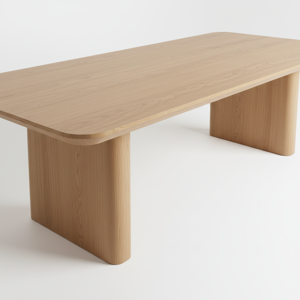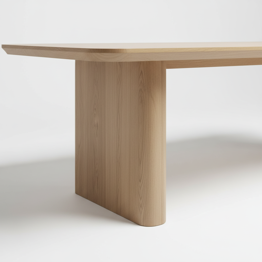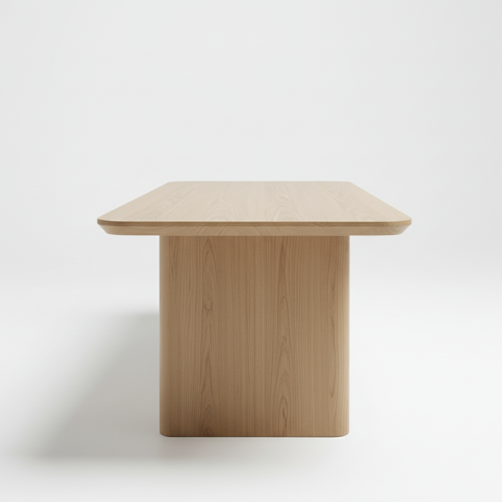 Willow Table sở hữu mặt bàn dài bo góc mềm mại, kết hợp cùng chân bàn dạng khối bản lớn, tạo nên một tổng thể chắc chắn nhưng không thô nặng.